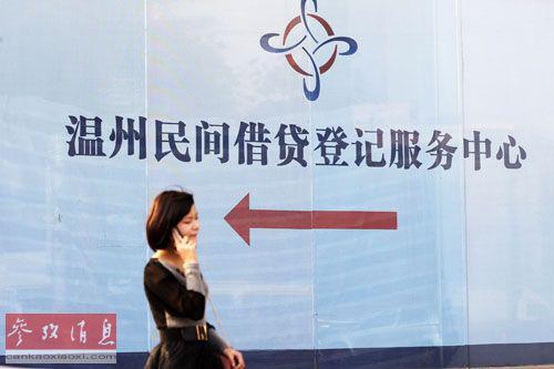 资料图片:2013年4月26日,一名女士从温州民间借贷登记服务中心指示牌下走过。新华社发(苏巧将摄)