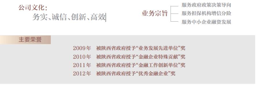 陕西省信用再担保有限责任公司(以下简称“公司”),2008 年11 月经陕西省政府常务会议批准设立,公司于2008 年12 月31 日挂牌,2009 年4月正式营业,目前注册资本金为4.17 亿元。公司旨在发挥再担保机构的政策导向作用,通过为陕西省各市(区)信用担保机构提供再担保,扩大各级信用担保机构担保能力,提升整体信用水平;防控和化解系统风险,加大对中小企业信贷支持力度;规范和完善陕西省信用担保体系,为中小企业及担保机构发展提供服务。