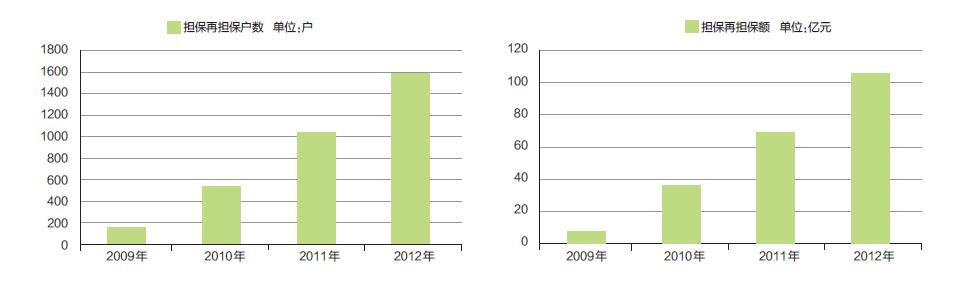 2009 年,公司通过担保再担保,使140 户企业实现融资7.7 亿元;2010 年,使526 户企业实现融资36.8 亿元;2011 年,使1033 户企业实现融资68.54 亿元;2012年,使1566 户企业实现融资105.18 亿元。