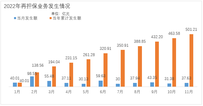 业务总量。2022年11月,四川省信用再担保有限公司(以下简称四川再担保)新增再担保业务3722笔,发生额37.63亿元;1-11月,当年新增再担保业务98560笔,发生额501.21亿元,同比增长39.92%;月末在保余额558.20亿元,同比增长48.24%。