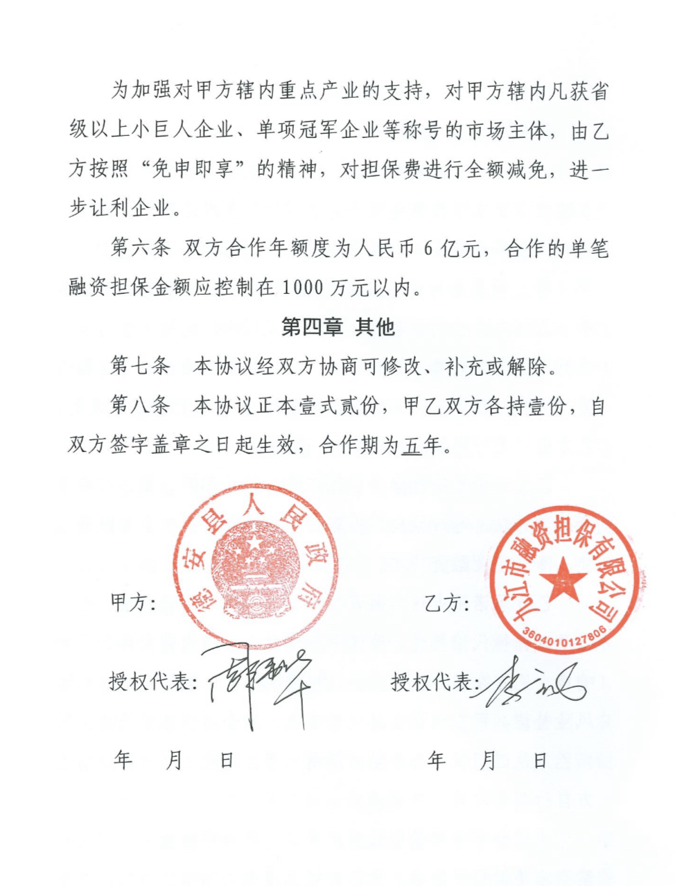 周三连书记对九江融担服务小微的积极成效给予了肯定。同时强调,县有关部门要运用好政府性融资担保体系优势,按照省财政厅要求建立县级风险补偿机制,在整体风险可控的前提下,按照优化营商环境一号改革工程的要求,用情用心把辖内小微企业的融资需求收集好、推荐好,发挥市县担保合作“见贷即保、承诺担保、无感服务”创新举措的积极作用,为辖内重点产业链、重点企业发展提供更多金融服务支撑。