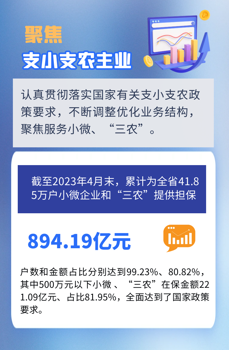 积极推进与银行金融机构、国家融资担保基金业务合作,不断深化协同支持小微、“三农”发展的工作格局。获得省内16家银行业金融机构授信总额221.2亿元,构建起了银担“3:7、5:5、8:2、9:1”等风险分担模式。推进与国家融资担保基金业务合作,着力推进“总对总”批量业务落地。截至2023年4月末,累计纳入国担基金备案业务规模99.75亿元,在保余额73.68亿元。