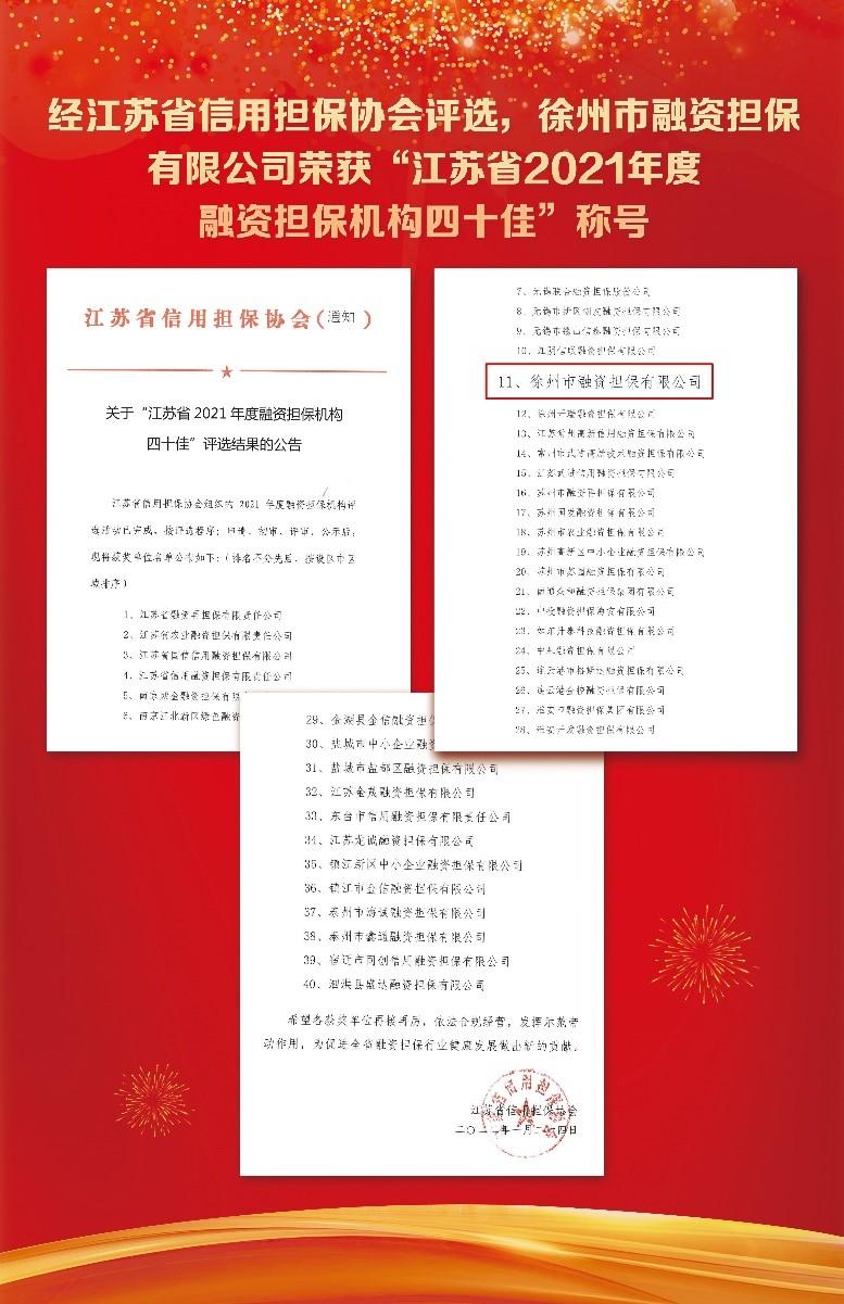 徐州市融资担保有限公司荣获“江苏省2021年度融资担保机构四十佳”称号(徐州市融资担保有限公司供稿)