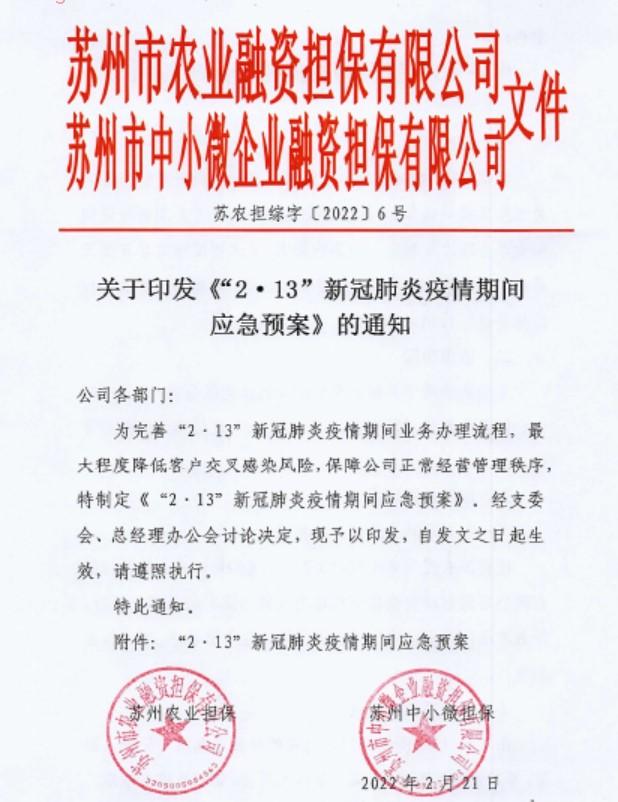 一是提高站位、服从大局,落实疫情防控要求。苏州农业担保党政领导班子充分认识到疫情防控的极端重要性,迅速传达贯彻《关于切实加强疫情防控工作的通知》(苏农发应急字【2022】3号)文件精神,牢固树立“事不过夜”、“24小时”观念,做实做细各项防控措施;强化办公场所的卫生防疫管理,配备必要的防护物品和设备,全面落实办公环境消杀、外来物品消毒等防疫工作,不漏一人、不留空白;强化人员管理,减少流动,加强个人防护,做好一线员工和来访人员的防控措施,做到不留死角、不留盲区,筑牢疫情防控严密防线;通过微信业务群、微信公众号等渠道,普及疫情防控知识,号召员工不信谣、不传谣,坚定员工战疫必胜信心。同时,苏州农业担保制定印发了《“2·13”新冠肺炎疫情期间应急预案》,从公司疫情防控、经营管理、业务及审批管理、印章管理、防疫物资管理、开具发票管理、记账凭证管理、在保业务应对、政策执行等方面,多维度着力完善“2·13”新冠肺炎疫情期间业务办理流程,最大程度降低客户交叉感染风险,有力保障了公司正常的经营管理秩序。
