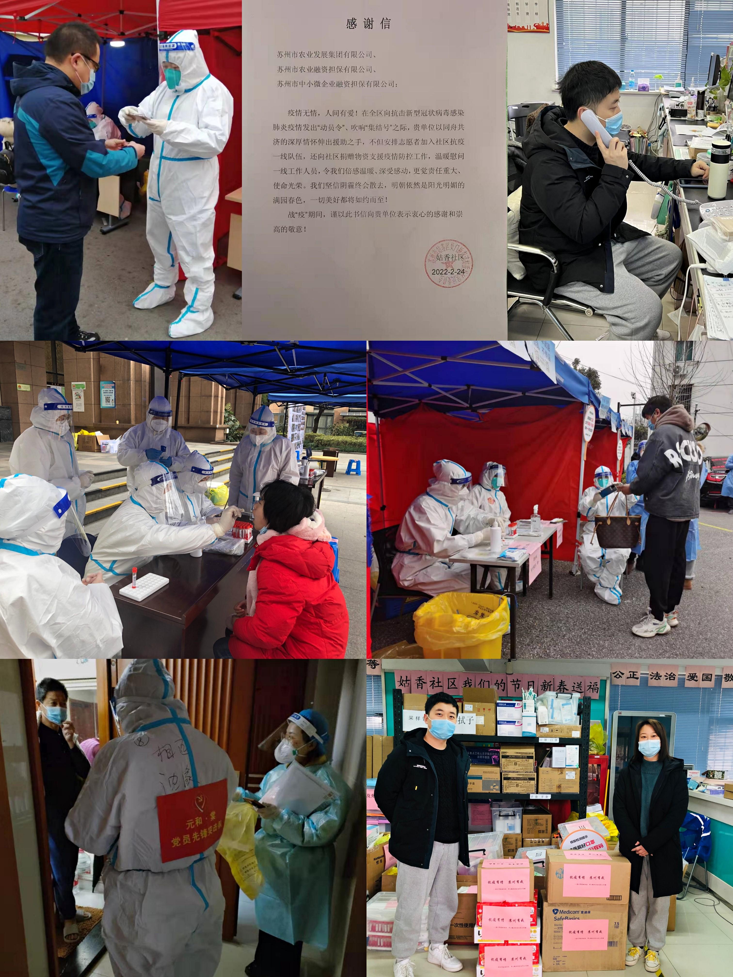 三是正确引导、积极组织,志愿服务齐心抗疫。充分发挥行动支部的战斗堡垒作用和党员干部先锋模范作用,凝聚强大抗疫合力,动员、组织32名党员、团员、民主党派人士以及青年骨干积极参与苏州市国资委、市金融监管局、农发集团等组织的疫情防控志愿服务活动。按照统一调配,分批奔赴大观社区、毛家桥社区、象牙社区、友联社区等,协助社区组织维护采样点现场秩序,对排队居民进行疏导、登记、检查健康码和行程码,配合好医护人员完成核酸采样工作,用实际行动帮助社区减轻防疫压力,在服务群众中亮身份、见行动、作贡献。其中,苏州农业担保还选派1名青年骨干下沉姑香社区助力疫情防控工作,得到了社区领导和居民的一致好评。截至2月24日18:00,累计服务58人次,服务总时长621小时。同时,居住在管控区的员工也积极投身到社区的疫情防控工作中。公司在员工范围内开展了“抗击疫情,奉献爱心”主题募捐活动,累计收到广大党员干部职工的爱心捐款8600元,用于支持一线疫情防控工作,并慰问抗疫一线工作人员,这一小小的善举也收到了受赠社区寄来的感谢信,令这个春寒料峭的初春暖意融融。