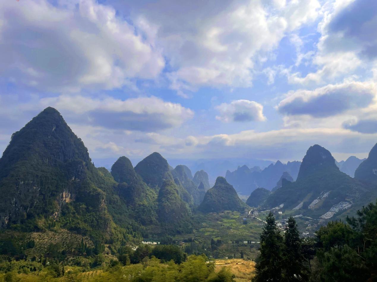 极目四野,碧蚰堆云,峰峦起伏,千岩竞秀,村道蜿蜒,曲径通幽,大自然的鬼斧神工在这里尽情挥洒,向世人展现着中华大地的壮美奇绝。——站在阳朔县画山云舍客房阳台,映入眼帘的是一幅天蓝、山青、地绿的桂林群山精美绝伦的画卷。