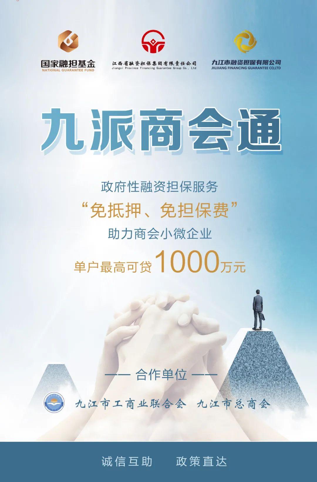通过此项工作开展,九江融担公司将通过九江市工商联(总商会)每年为九江市非公有制经济组织(商会)会员企业提供总额30亿元的无抵押担保贷款授信,运用商会行业自律、诚信互助的优势,专属开发“九派商会通”政府性融资担保产品,通过商会“白名单”机制,可以为单户小微企业提供高达1000万元的“免抵押、免担保费”的普惠金融服务。