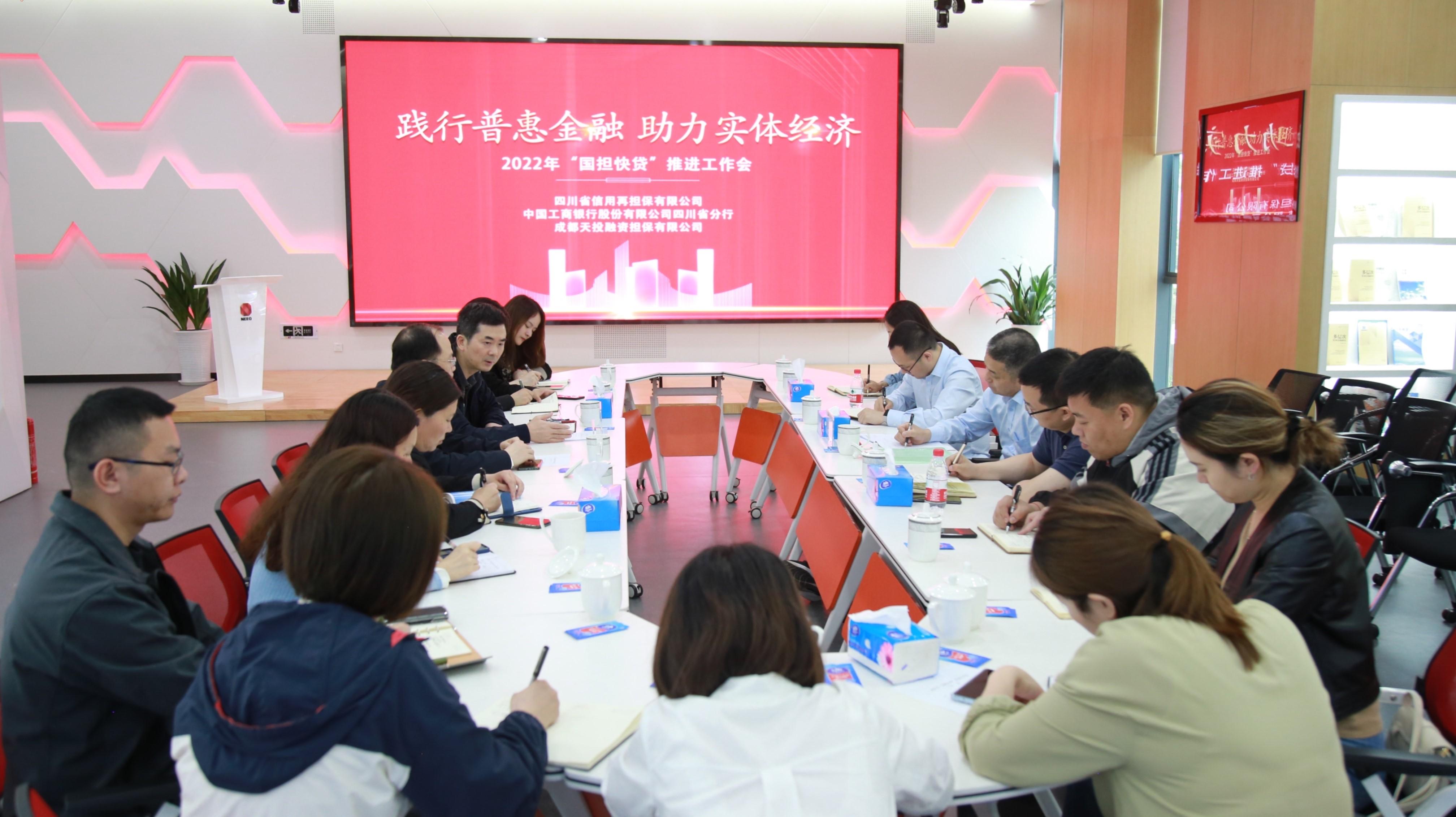 近日,四川省信用再担保有限公司(以下简称四川再担保)与工商银行四川省分行、成都天投担保召开一季度“国担快贷”推进工作会。四川再担保总裁覃建华、工行四川省分行普惠金融事业部总经理余平、成都天投担保董事长冉棋文、总经理邱倩参加会议。
