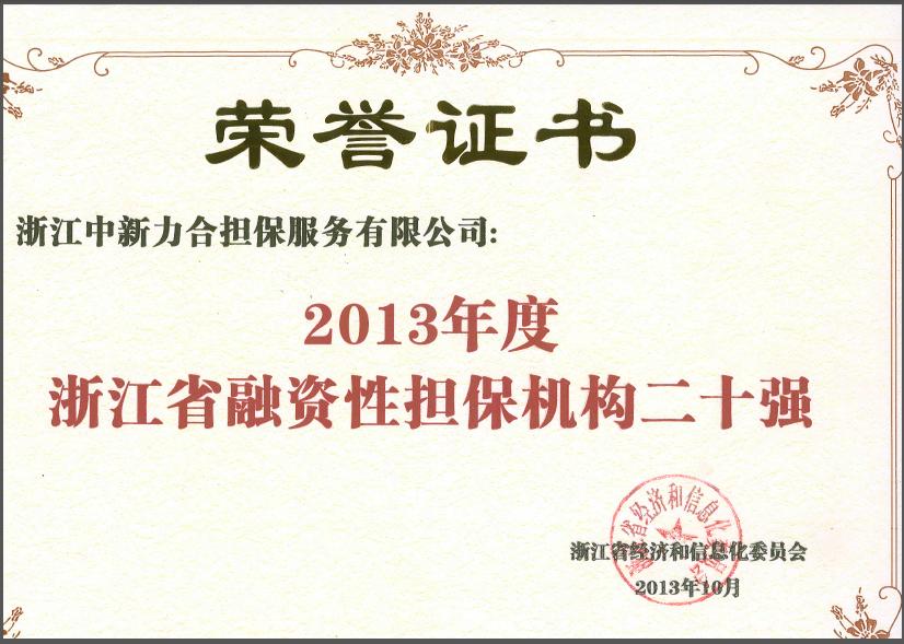 中新力合担保服务荣膺由浙江省经济和信息化委员会授予的“2013年度浙江省融资性担保机构二十强”称号。