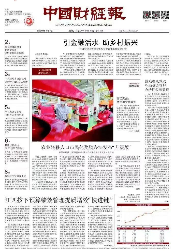 5月10日,《中国财经报》头版头条刊发专题报道《引金融活水 助乡村振兴——全国农业信贷担保体系支持农业农村发展纪实》,充分肯定6年来农担实践成效,报道指出,农担作为财政支农方式的重要创新,农担体系已经成为放大财政支农政策效应、提高财政支农资金使用效益、实施乡村振兴战略的重要载体。