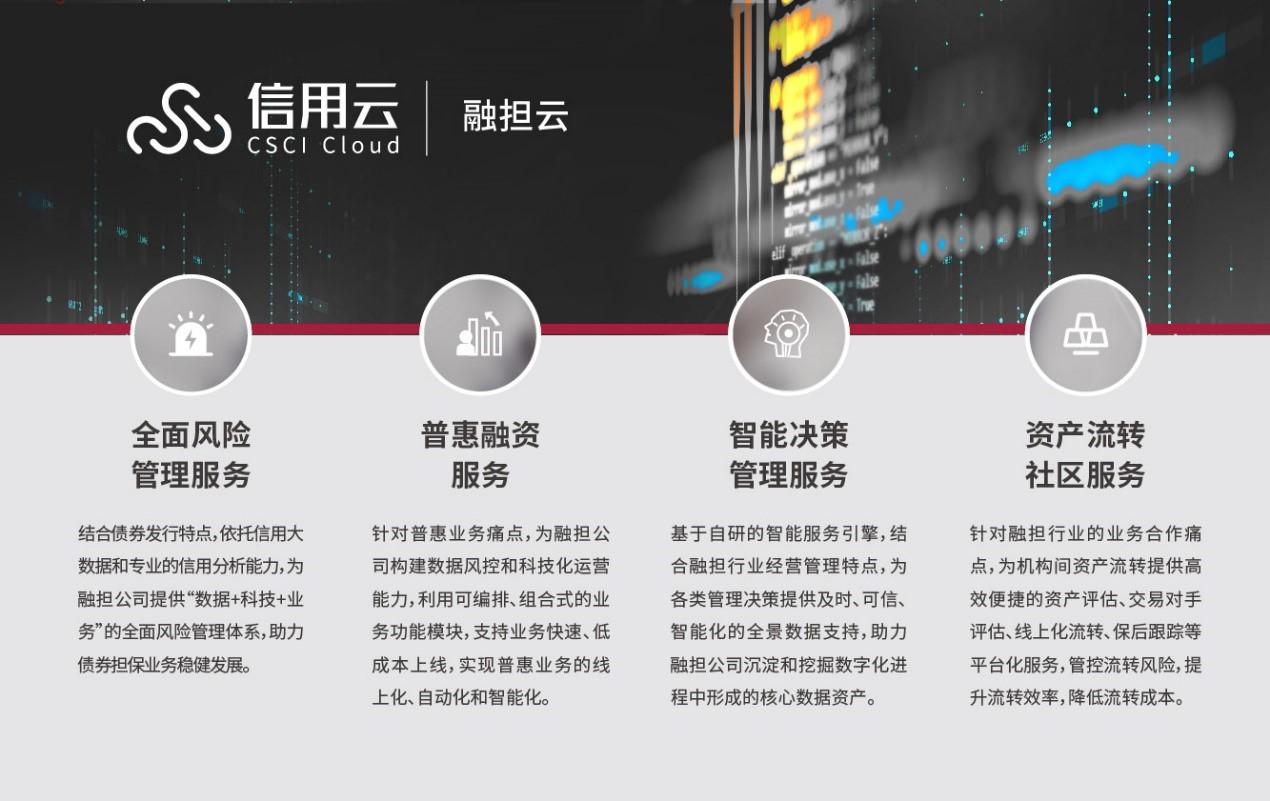 针对融担行业存在的痛点,中证信用依托多年的业务实践、专业的信评能力、丰富的数据资源,以及科技化手段,推出了行业领先的数字化解决方案——“融担云”。“融担云”基于债券发行担保、普惠融资担保、融担资产流转三大业务场景,针对行业急需的业务数字化和管理数字化的共性需求,推出了包括全面风险管理服务、普惠融资服务、智能决策管理服务、资产流转社区服务在内的四大云服务,以“数据+科技+业务”的全新模式来服务和赋能同行,全面助力融担公司数字化转型。