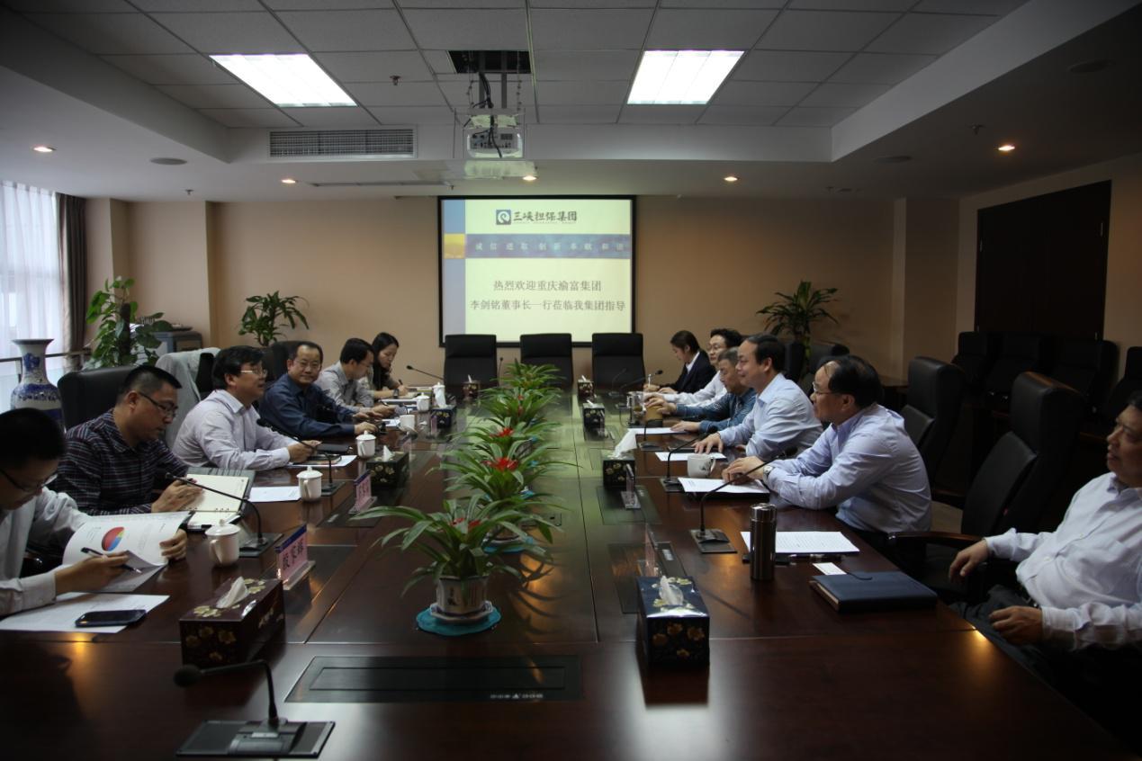 4月16日,三峡担保集团李卫东董事长,刘兴义总裁,魏明书、邵有佩副总裁及有关部门负责人与来访的集团股东重庆渝富集团党委书记、董事长李剑铭,副总经理覃伟一行举行亲切座谈。